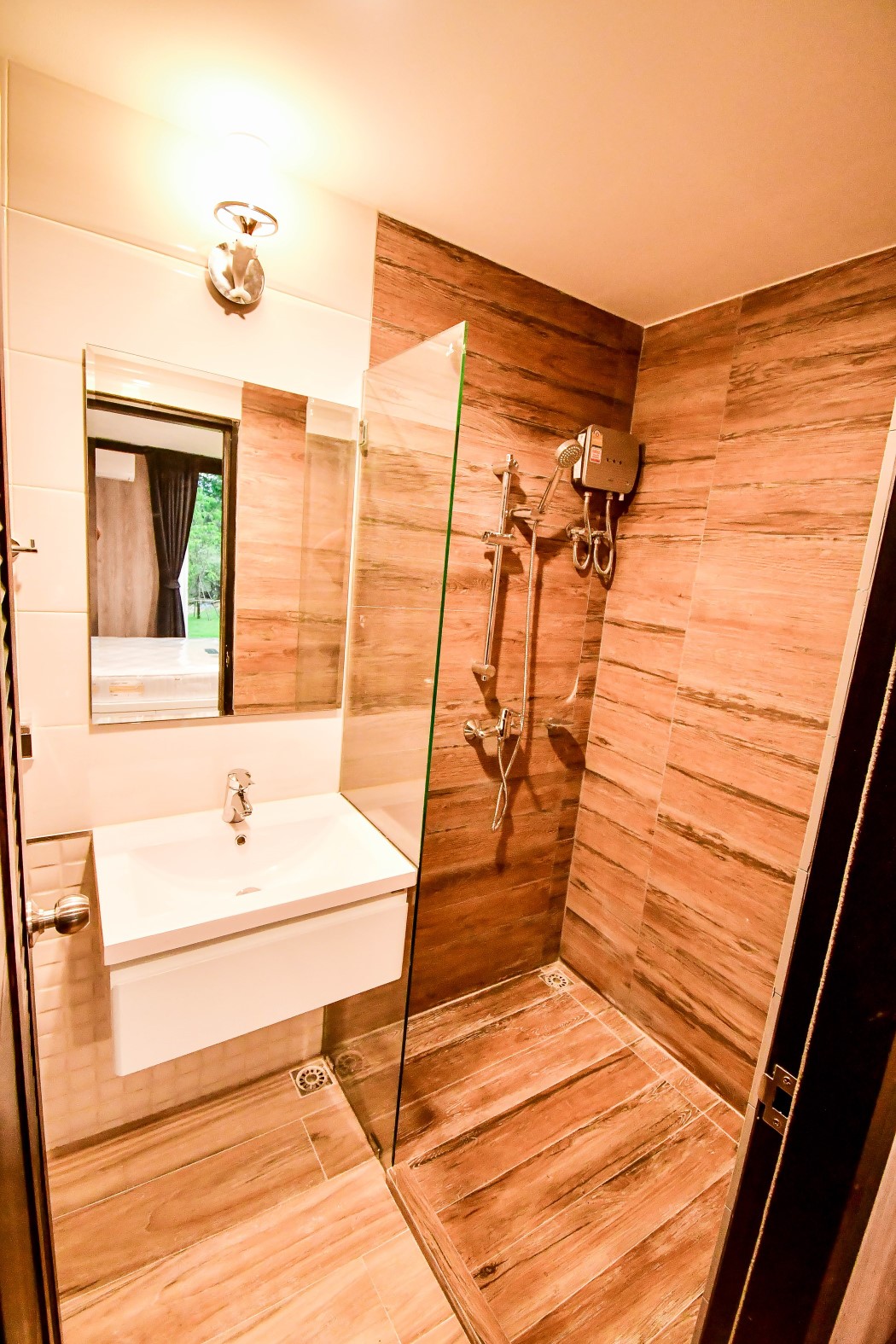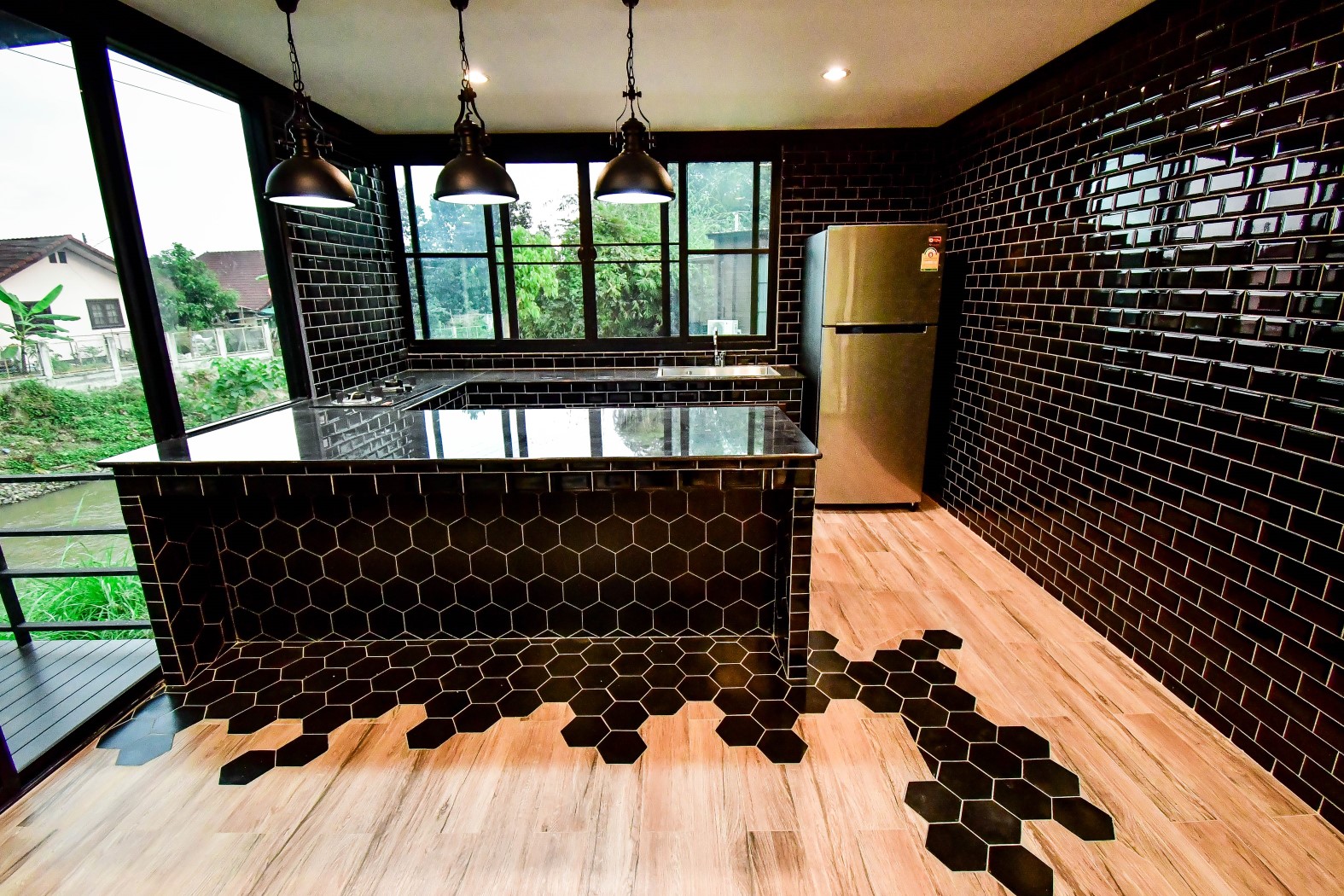 • Interior wall with laminate patterned / decorative wood / tiles.