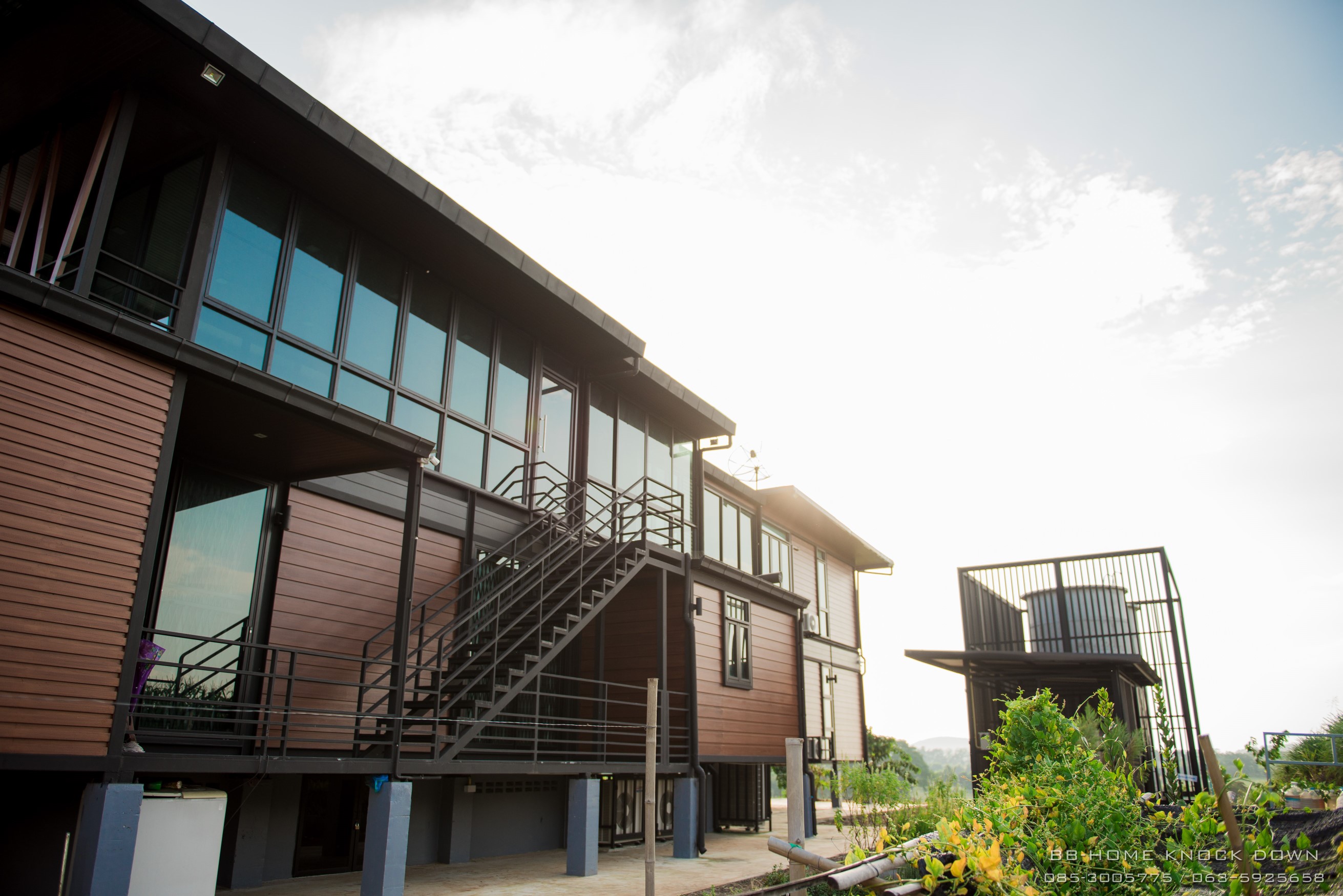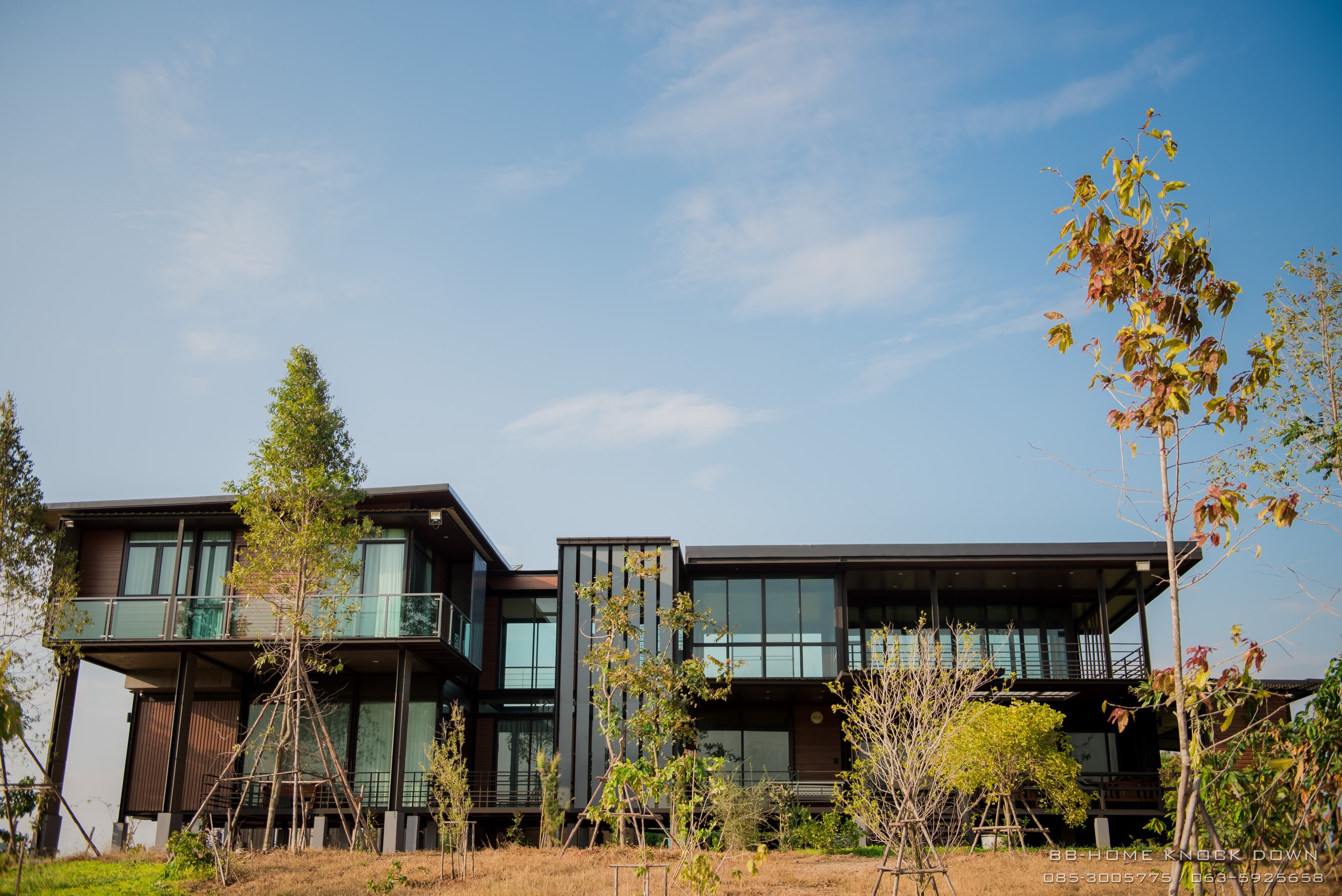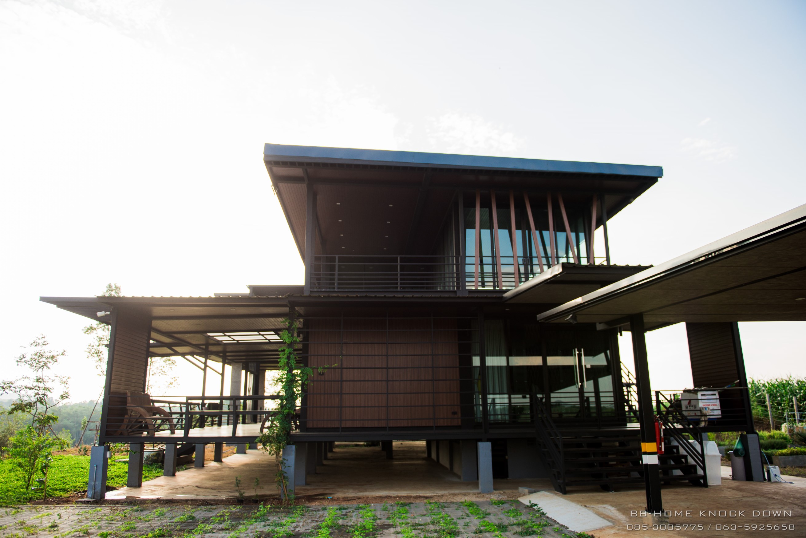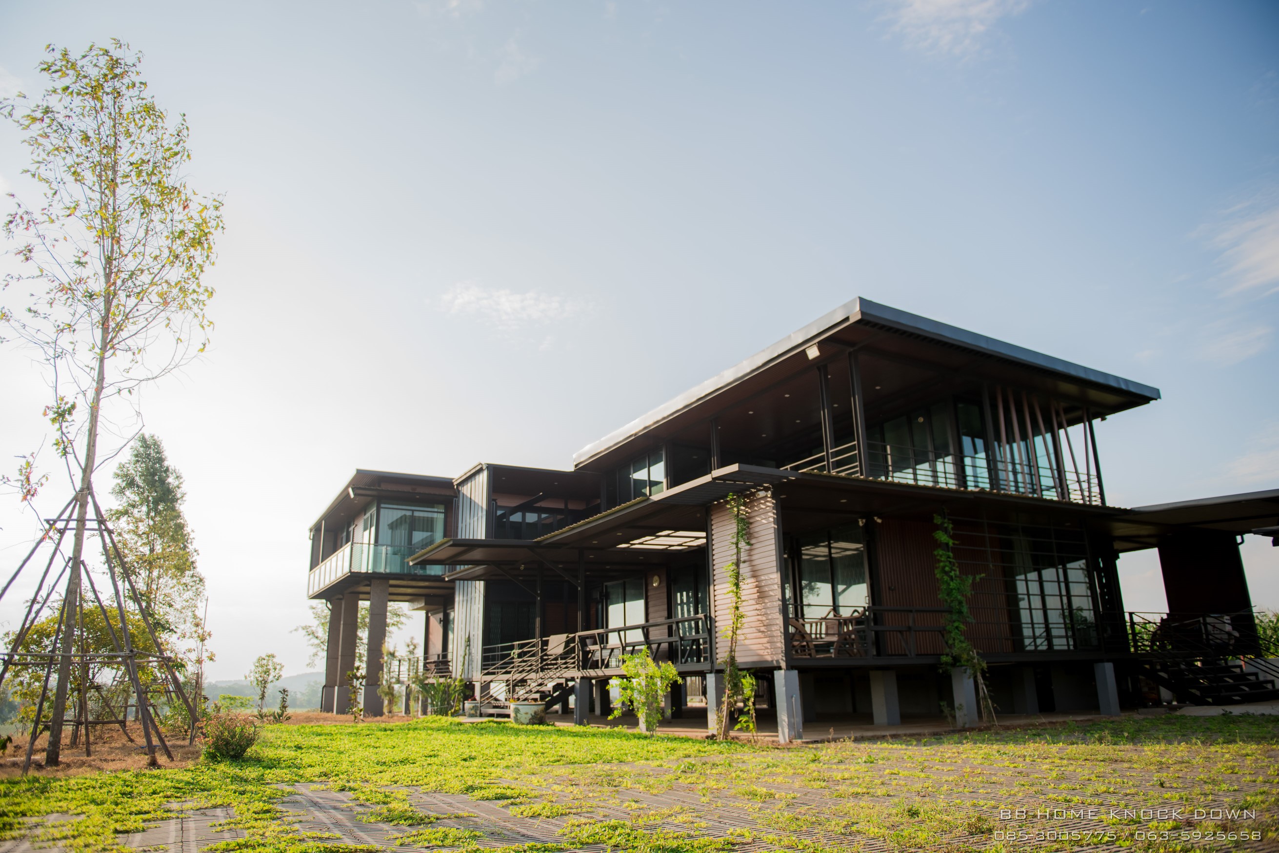 The 2-story steel frame knock-down holiday house is a design for a large family home that needs functions. Do activities together Organize a party With a balcony to view the common area Is a large living room With a kitchen to cook warm meals with a shared bathroom To be used to welcome friends who come to socialize The second floor has a large event hall especially for socializing. With a balcony to see Evening and morning In the midst of a mountain covered with thin mist Is a design and design to meet the needs of use with a simple, modern look, natural additive with materials. (คำบรรยาย)