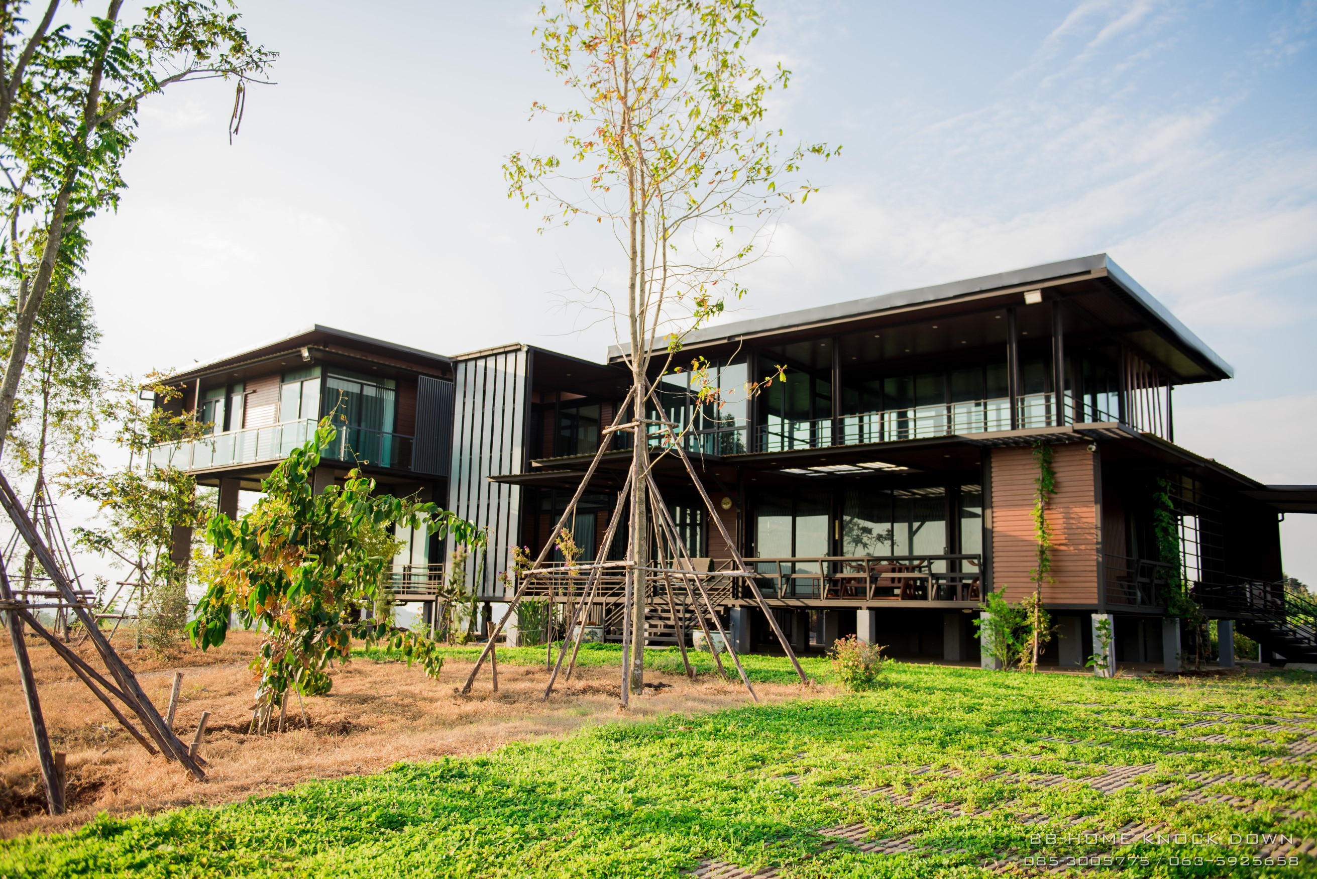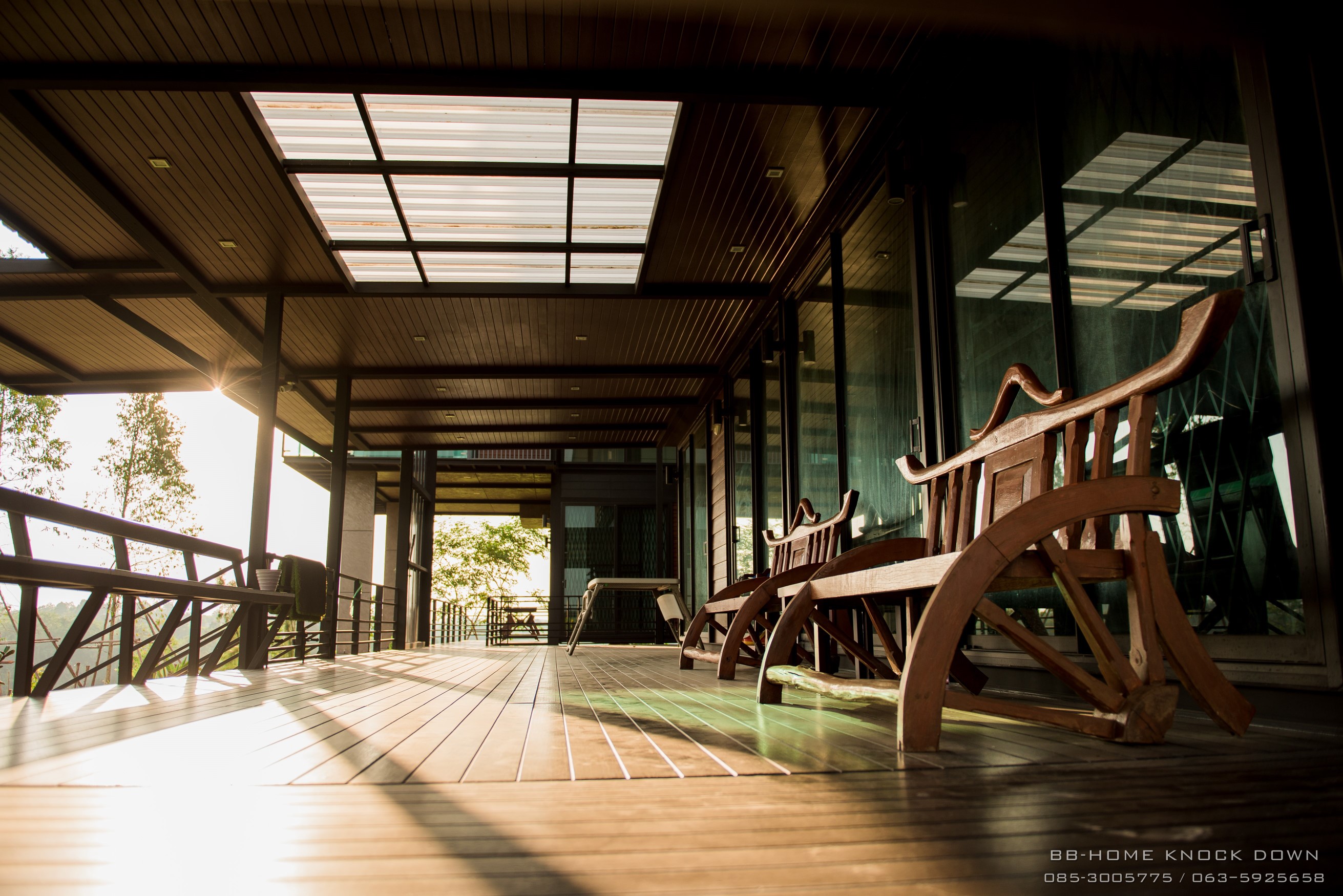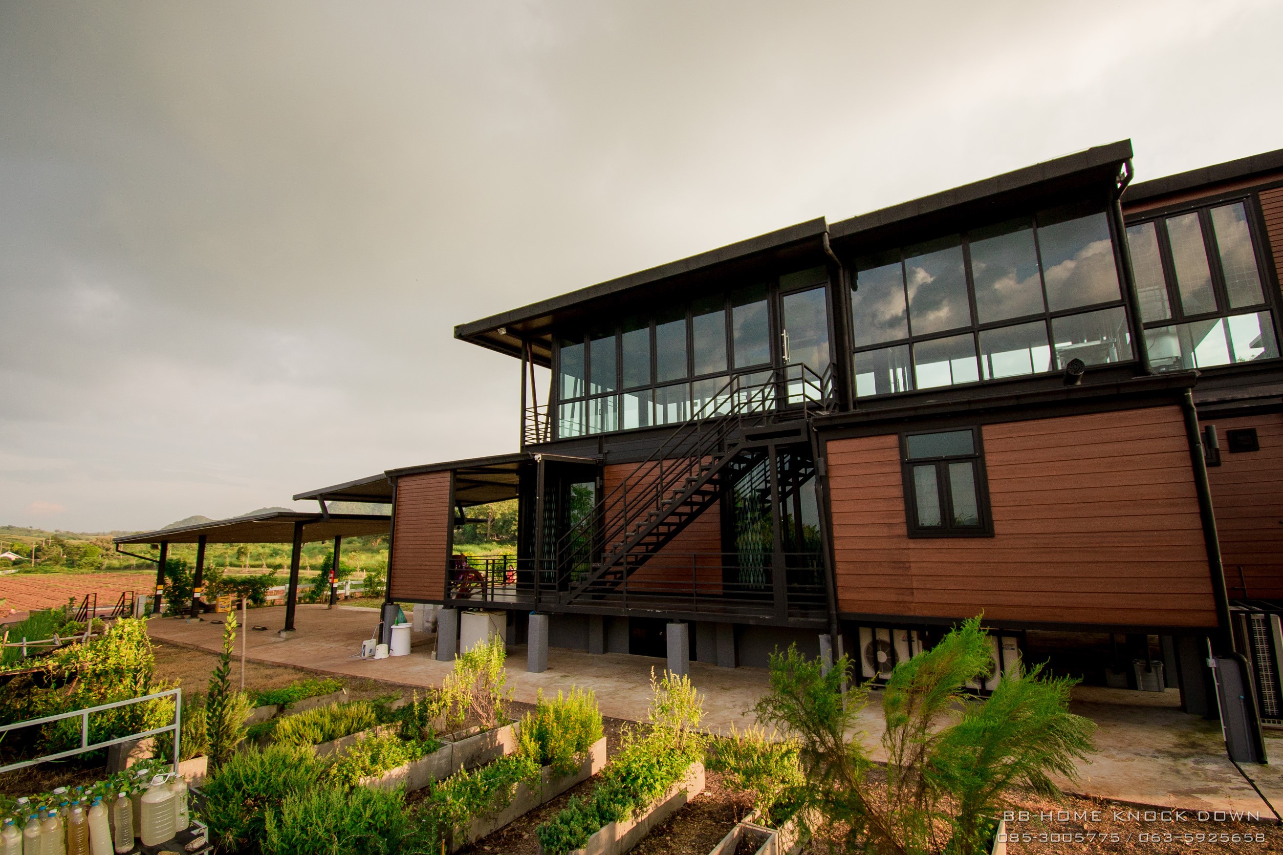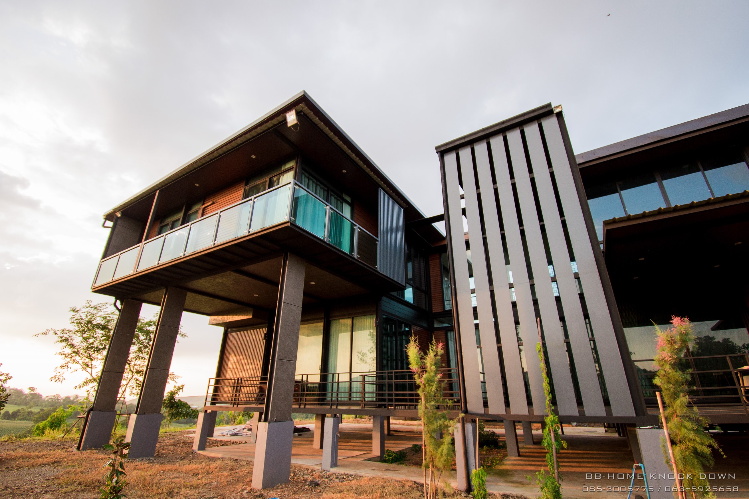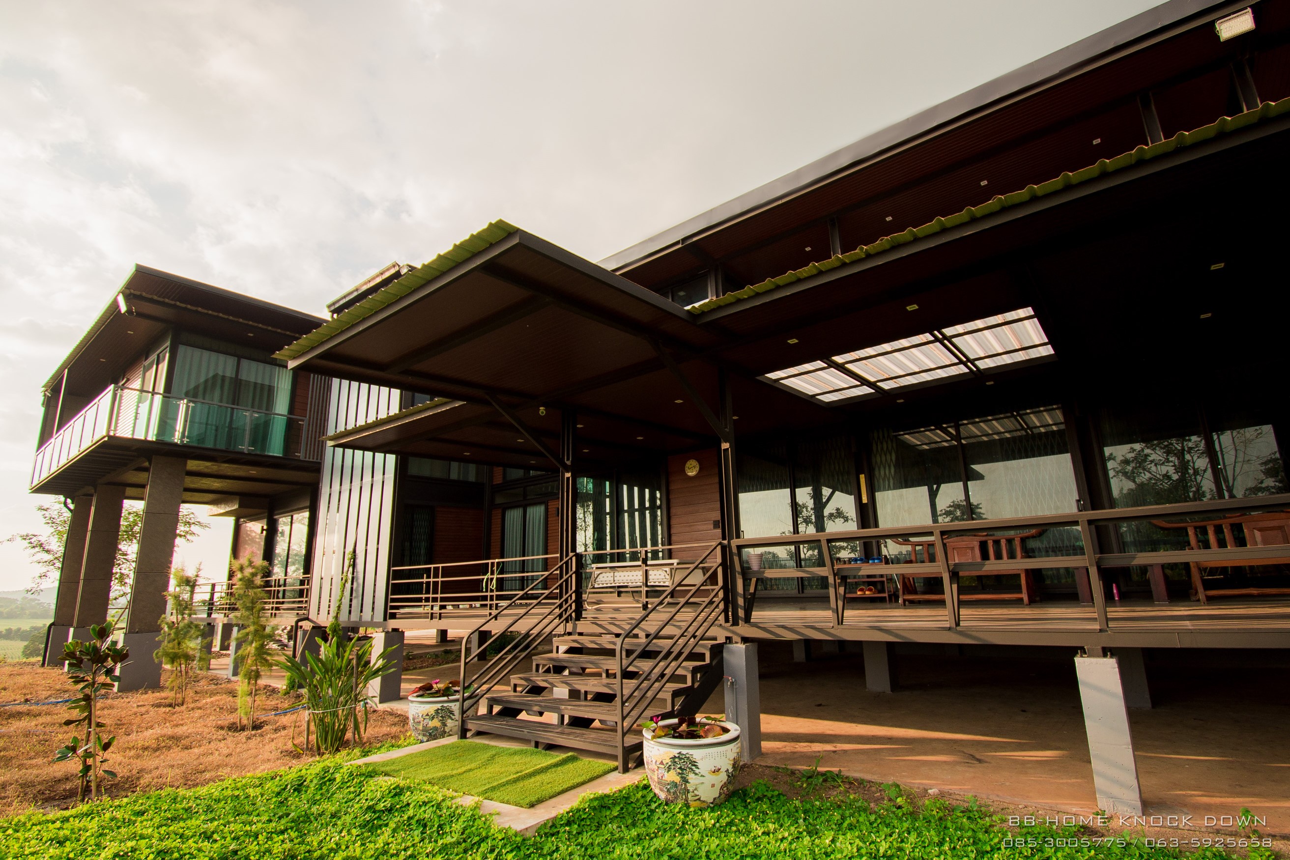 The 2-story steel frame knock-down holiday house is a design for a large family home that needs functions. Do activities together Organize a party With a balcony to view the common area Is a large living room With a kitchen to cook warm meals with a shared bathroom To be used to welcome friends who come to socialize The second floor has a large event hall especially for socializing. With a balcony to see Evening and morning In the midst of a mountain covered with thin mist Is a design and design to meet the needs of use with a simple, modern look, natural additive with materials. (คำบรรยาย)