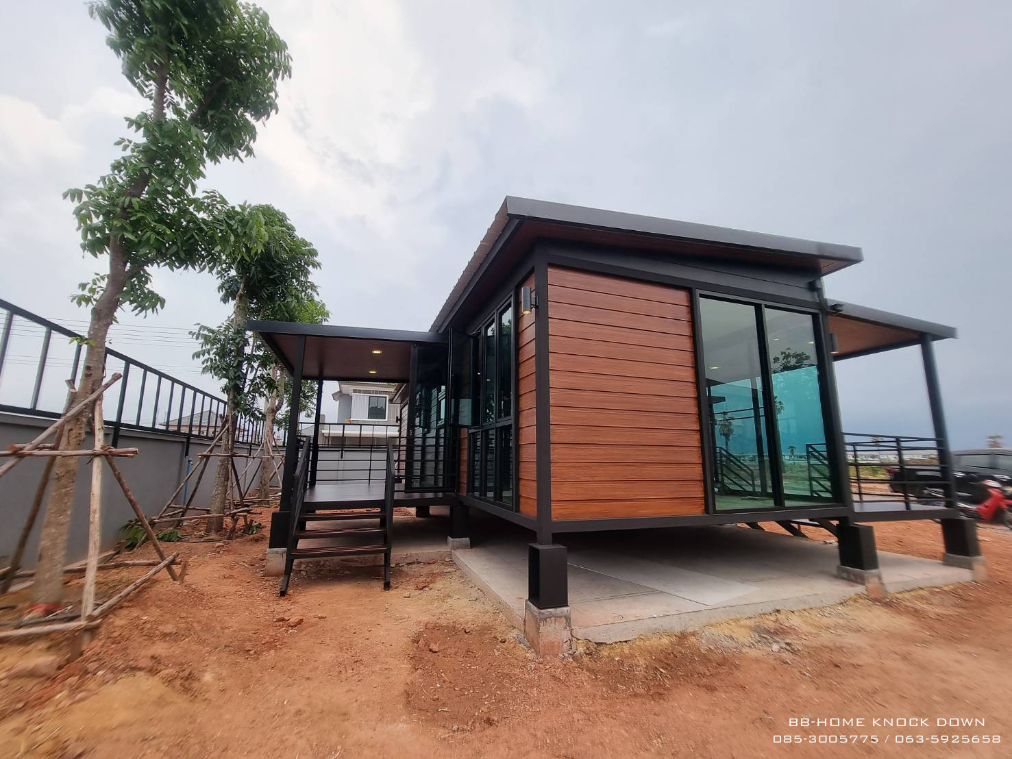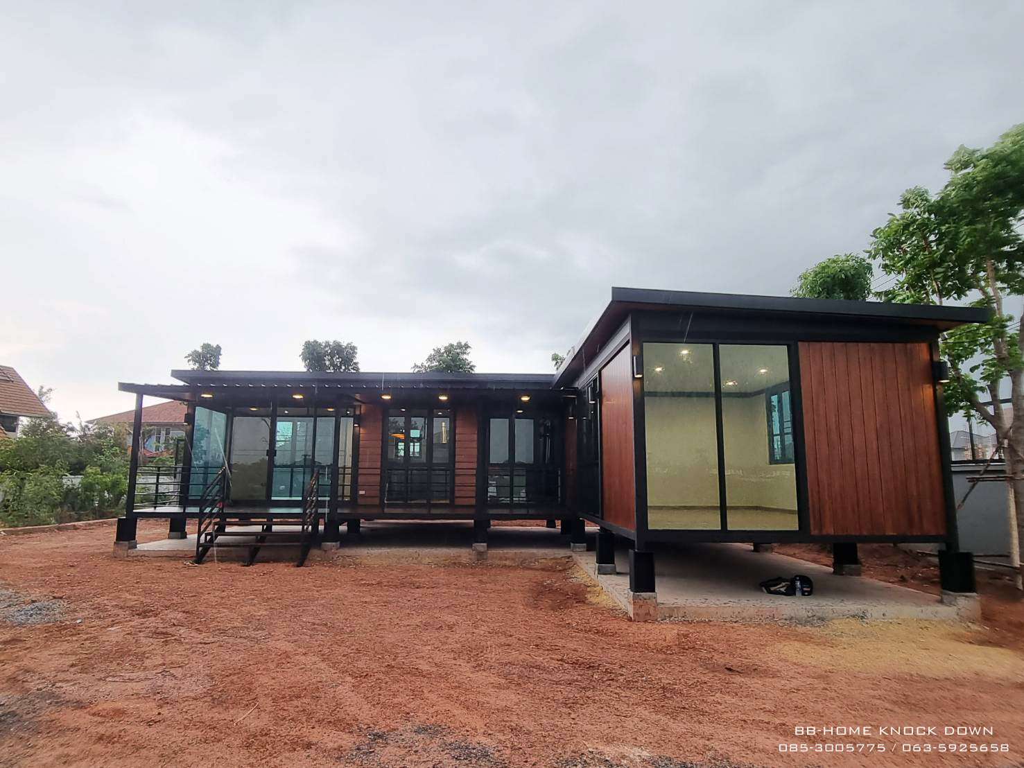 L-Shaped knock down house. It is coming with a classic design by the steel structure and the house is designed to be elevated. The function in the house is completely convenient for your living. In front of the house also has a wide balcony for relax and your purpose activities. (คำบรรยาย)