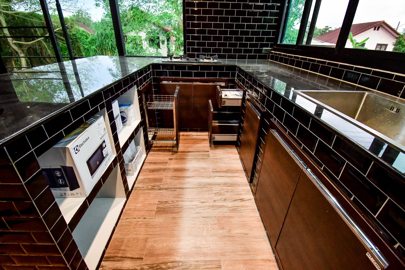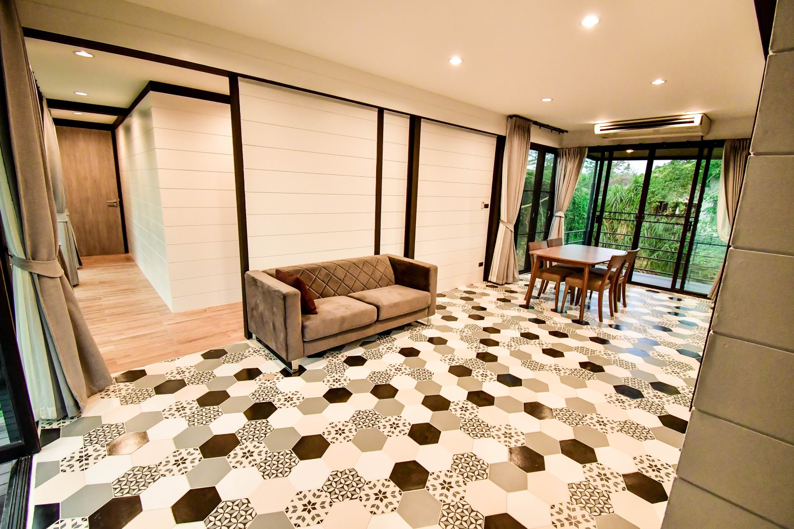 • Interior wall with laminate patterned / decorative wood / tiles.
